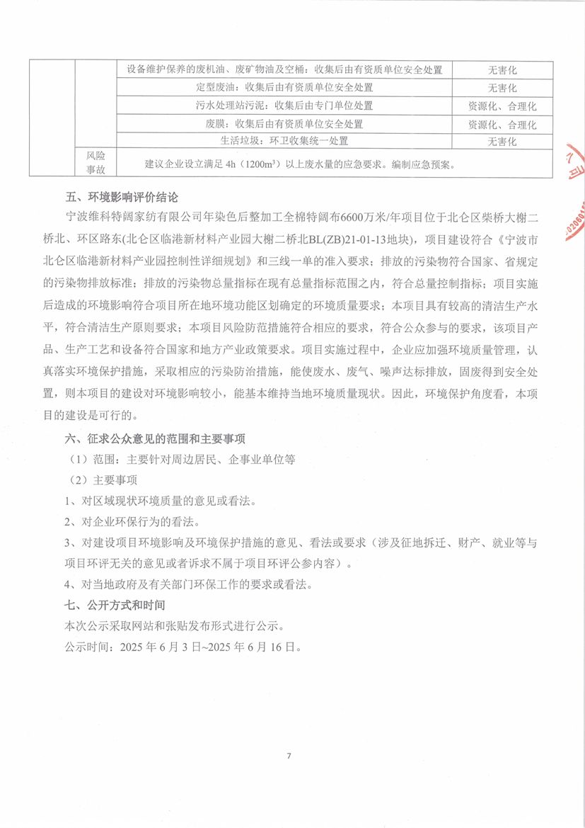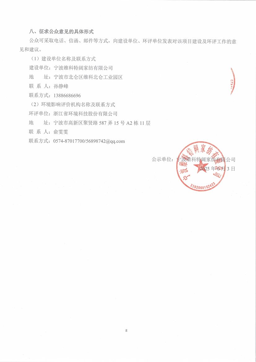 我公司的《寧波維科特闊家紡有限公司染色后整加工全棉特闊布6600萬米/年制造項(xiàng)目環(huán)境影響報(bào)告書》已完成編制,根據(jù)《浙江省建設(shè)項(xiàng)目環(huán)境保護(hù)管理辦法》(2021年修正)(省政府令第388號),現(xiàn)對項(xiàng)目主要內(nèi)容進(jìn)行公示。
